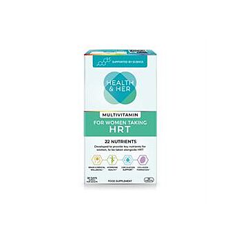 When it comes to multivitamins for women, it's not one-size-fits-all. Every stage of hormonal health brings its own nutritional requirements. Health & Her Multivitamin To Support Women Taking HRT has been formulated to replenish the essential nutrients known to deplete in women whilst taking Hormone Replacement Therapy (HRT), along with a full spectrum of vitamins & minerals to support everyday wellbeing. PLUS a full spectrum of vitamins and minerals carefully blended to support daily wellbeing Suitable for women taking all forms of HRT* BRAIN HEALTH Pantothenic acid contributes to normal mental performance. Iron and Iodine contribute to normal cognitive function PSYCHOLOGICAL FUNCTION Biotin, Folic Acid, Magnesium and Vitamin B12 contribute to normal psychological function HORMONE REGULATION Vitamin B6 contributes to the regulation of hormonal activity. Iodine contributes to the normal production of thyroid hormones TESTOSTERONE LEVELS Zinc contributes to the maintenance of normal testosterone levels in the blood BLOOD CLOTTING SUPPORT Calcium contributes to normal blood clotting FORMATION OF RED BLOOD CELLS Iron contributes to normal formation of red blood cells and haemoglobin BONES & JOINTS Vitamin C contributes to normal collagen formation for the normal function of bones and cartilage, which form part of your joints SKIN, HAIR & NAILS Vitamin C contributes to normal collagen formation for the normal function of skin. Zinc contributes to the maintenance of normal skin, hair and nails *Replenishes Vitamins B6, B12 and C, Folic Acid, Magnesium, Selenium and Zinc - nutrients scientifically shown to deplete in women taking hormone replacement therapy (HRT)