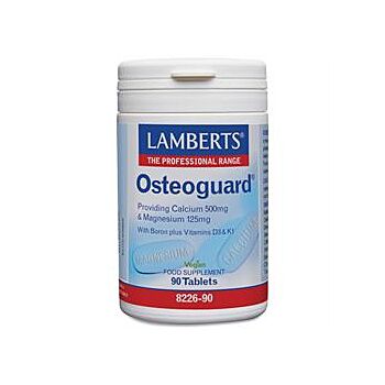 Lamberts Osteoguard is a comprehensive all-in-one supplement, expertly formulated to aid normal bone and muscle function. Supplying all of the key nutrients at safe yet nutritionally relevant levels, each tablet provides three fine grade minerals: 500mg of calcium, 125mg of magnesium, and 1.5mg of boron, plus 10ug of vitamin D3 and 75ug of vitamin K. It is well established that many peoples' diets are deficient in the two essential bone-making nutrients, calcium and magnesium, and that low calcium intakes can contribute to the rate at which bone mass declines with age. The Department of Health (DoH) recommends that women should have an intake of up to 1200mg of calcium per day, a level that is hard to achieve through diet alone, especially if the diet contains little dairy produce. Magnesium, which is increasingly absent from the food we eat, is known to help in the deposition of calcium in bones. Both of these minerals contribute to the maintenance of normal bones, whilst there is some evidence to suggest that boron may also help to maintain joint and bone health. Osteoguard is complete by the addition of vitamins D and K, enabling the effective disintegration and utilisation of calcium and magnesium by the body. Our expert technical advisors often recommend Osteoguard as an excellent partner to a multiple formula.