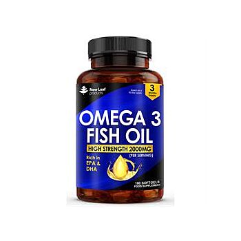 HIGH-QUALITY OMEGA-3 FISH OIL New Leaf's Omega-3 Fish Oil Softgels provide 2000mg of Omega-3 fatty acids per serving, enriched with Vitamin E to support overall health. Each serving contains EPA and DHA, essential fatty acids sourced from high-quality fish oil. With 180 softgels in each bottle, you receive a three-month supply, making it easy to incorporate these crucial nutrients into your daily routine to support heart, brain, and eye health. SUPPORTS HEART HEALTH EPA and DHA, found in New Leaf's Omega-3 Fish Oil, contribute to the normal function of the heart, helping maintain cardiovascular health. These essential fatty acids are recognized for their role in promoting heart function, making this supplement ideal for those seeking to support a healthy circulatory system. Regular intake of Omega-3 ensures your heart receives the nourishment it needs to function optimally. PROMOTES BRAIN FUNCTION AND VISION DHA, one of the key Omega-3 fatty acids in this formula, is vital for maintaining normal brain function. It also contributes to the maintenance of normal vision, making it essential for cognitive and eye health. The added Vitamin E helps protect the fatty acids from oxidation, ensuring the potency of each softgel. This combination offers comprehensive support for your brain, eyes, and overall well-being. SAFETY INFORMATION Do not exceed stated dose. If you are pregnant, breastfeeding, taking any medications or under medical supervision, please consult your doctor or healthcare professional before use. Not suitable for persons under the age of 18. Store in a cool, dry place and keep away from children at all times. Food supplements should NOT be used as a substitute for a balanced diet and healthy lifestyle. Discontinue use and consult a GP if adverse reactions occur. INGREDIENTS Omega-3 Fish Oil (18/12 EE), Softgel Shell (Gelatine, Glycerin, Purified Water), Vitamin E (DL-Alpha Tocopheryl Acetate) DIRECTIONS Take two softgels per day with a full glass of water. Do not exceed stated dosage.