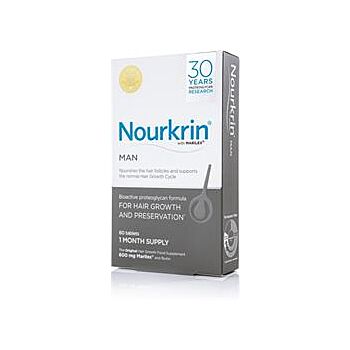 100% naturally based food supplement that is designed to supply the body with the specific nutrients needed to promote good, natural hair growth. Nourkrin® Man is a formulation specifically for men. Nourkrin® Man is an entirely natural drug-free food supplement that is fortified with vitamins and is designed to supply your body with the specific nutrients needed to promote good, natural hair growth from the follicles. The key ingredient is the exclusive Marilex® (a deep sea fish derived marine extract). Two new key ingredients have been added - Omega 3 Fatty Acid and the natural herb, Fenugreek. Clinical studies support that these ingredients help re-grow thinning hair in men by improving the condition of the hair follicles. Take 2 tablets daily - one in the morning and one in the evening.