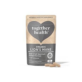 Lion's mane is well-known for its remarkable ability to enhance cognitive functions, largely due to compounds known as hericenones that boost nerve growth factor (NGF), a key element for brain health. However, hericenones are sensitive to a variety of factors, from the mushroom's cultivation to the extraction process, which can impact their concentration. This is important because they naturally occur in small amounts; a little of these compounds go a long way, but due to their sensitivity, it's important to ensure their presence. Together Health's organic Lion's Mane supplement ensures a high level of these compounds. By using 100% fruiting bodies, meticulous selection of optimal growing mediums, time-honoured growing techniques and advanced extraction methods. Together Health guarantees a hericenones content of over 1.5% and confirms this with rigorous batch testing. Together Health's high-strength formulation is also unique, it contains a combination of a concentrated 20:1 dual extract and a full spectrum extract, equivalent to 9740 mg of mushroom. This blend boasts more than 40% polysaccharides, including 30% of the most important polysaccharide, beta-glucans. These high levels offer you a broad range of lion's mane's health benefits, extending beyond brain health. The blend also provides the complete nutritional profile of the mushrooms and delivers the full spectrum of beneficial compounds in an easy-to-absorb form. Together Health believes there is a complex interplay between all the compounds present in mushrooms and maintaining this interplay will have synergistic benefits for health and absorption. What makes Together Health's Lion's Mane so special: Organic Certified 100% fruiting bodies High-strength 1000 mg formula Provides equivalent to 9740 mg of mushroom Guaranteed > 40% polysaccharides and > 30% beta-glucans Guaranteed > 1.5% hericenones Concentrated 20:1 dual extract provides high levels of beneficial compounds Full spectrum extract provides a complete nutrient profile Highly bioavailable & fast absorbing Never any artificial additives or processing aids Made with simple chemical-free processes Easy to take Plastic-free & compostable packaging Certified vegan & cruelty-free Gentle on the stomach No heavy metals Raw ingredients Free from Wheat; Soya; Gluten; Dairy; GM Ingredients. Third-party batch tested Manufactured to ISO / GMP / BRC accreditation